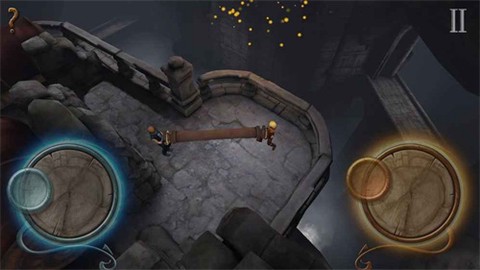 1、游戏伊始,跟随指引朝桥的方向前进,你会遇到一个简单的解谜环节。在这里弟弟力气不足,记得用哥哥来扳动把手,成功过桥后向右走,来到一个断梯下,哥哥需要将弟弟抬上去,弟弟再去放下旁边的绳子,帮助哥哥上去,然后两人一起合力扳动升降机的把手。