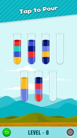 2、你的目标是将不同颜色的液体成功地移动到同一个容器中。这个过程不仅考验你的逻辑思维,还需要一定的策略规划。